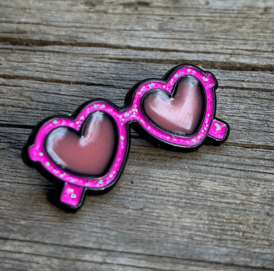 1.25” glitter pink frames with pink stained glass lenses.